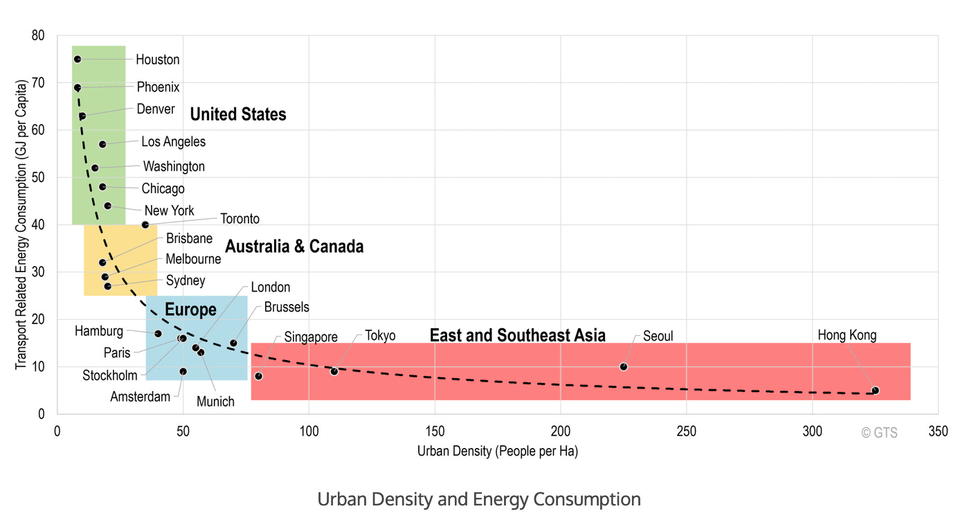 As you progress downward and to the right, the cities become more dense and the energy costs associated with travel decline because places of interest are closer together and there are multiple public transit options.